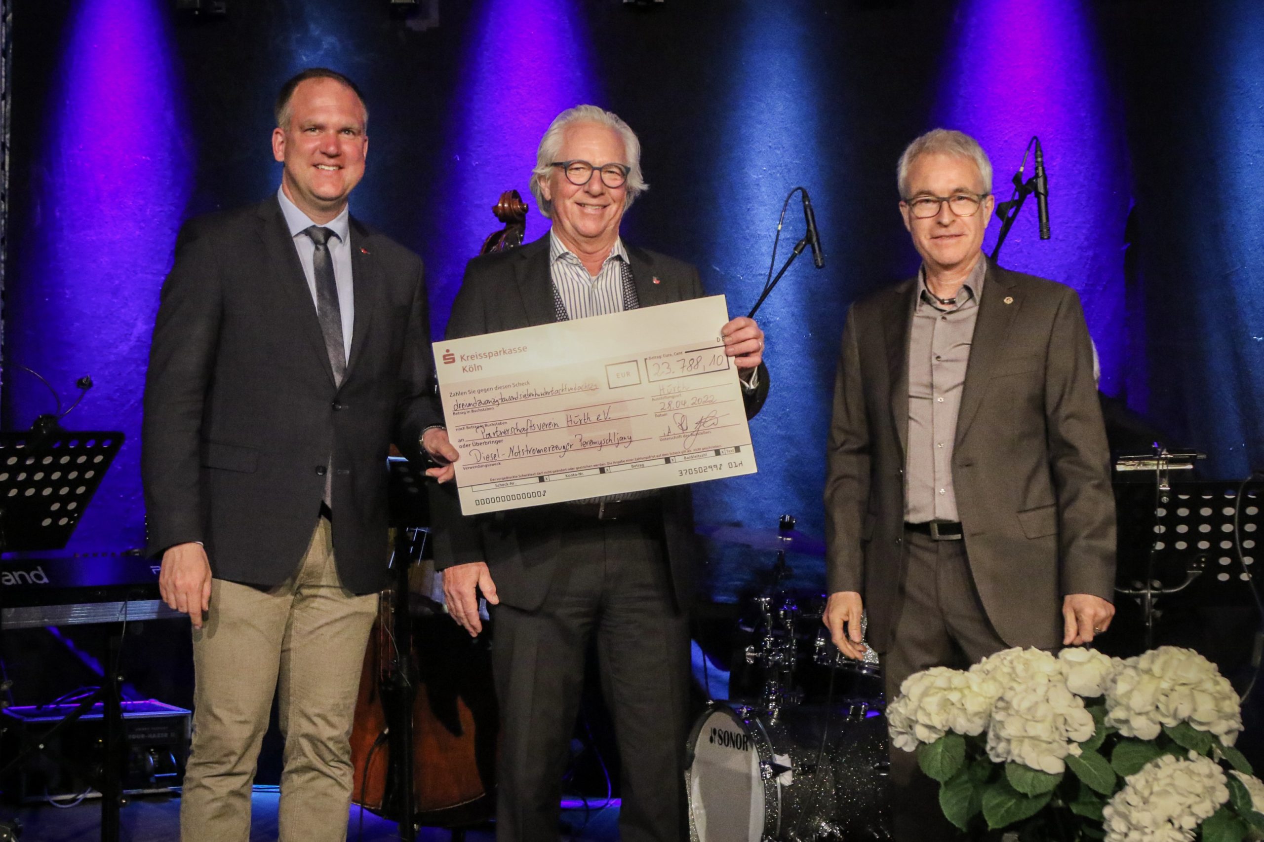 “Im Namen des PVH und unserer Freunde in Peremyschljany darf ich mich herzlich für die großzügige Unterstützung der gemeinsam mit der Stadt Hürth organisierten Hilfsaktion bedanken. Dieser Dank gilt insbesondere für die vollständige Finanzierung des in Peremyschljany dringend benötigten Notstromaggregats, das zur Aufrechterhaltung des Krankenhausbetriebes und der Wasserversorgung die erforderliche Versorgungssicherheit mit Energie schafft”, bedankte sich PVH Vorsitzender Rüdiger Winkler bei der Spendenübergabe im Rahmen der Feier zum 25-jährigen Jubiläum des Lions Clubs Hürth bei dessen Präsidenten Hans-Peter Tschorn. Den Scheck in Höhe von 23.788,10 Euro reichte Winkler sogleich an den PVH Schatzmeister Reinhard Schmitt-Berger weiter, um die bereits vorliegende Rechnung zu bezahlen.